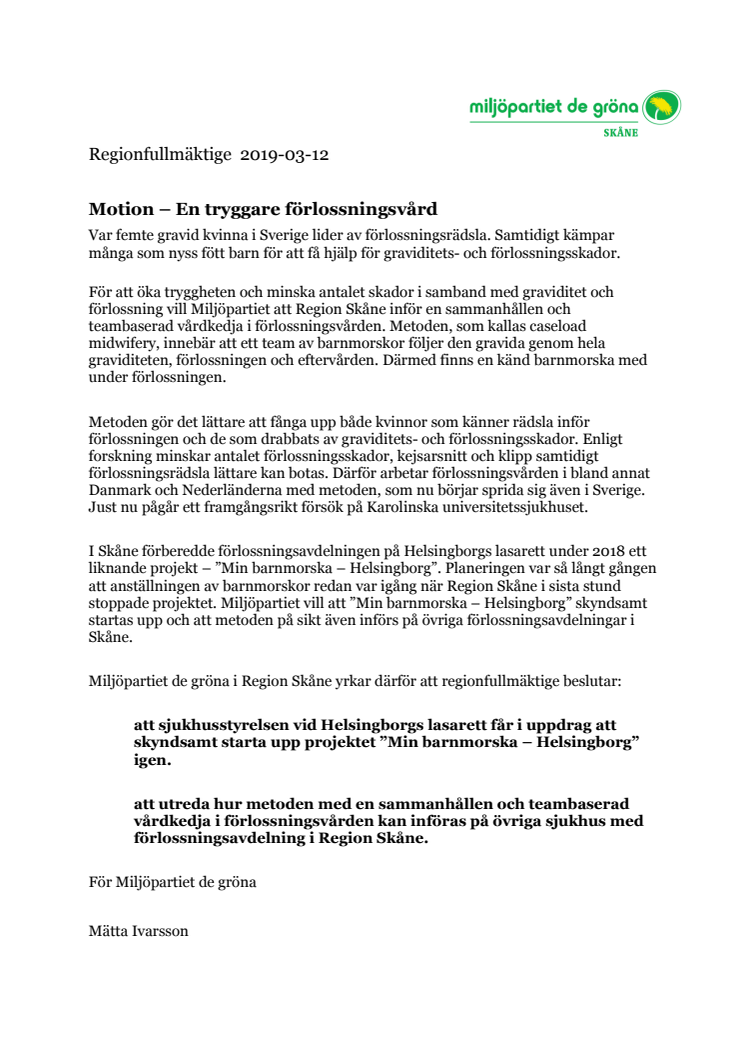 Det fick Miljöpartiet att reagera och lämna in en motion om att skyndsamt starta upp försöket i Helsingborg igen och samtidigt utreda hur metoden kan införas på övriga sjukhus med förlossningsavdelningar i Region Skåne.