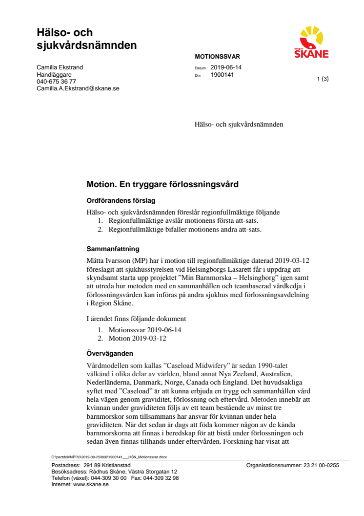 Föd med en barnmorska du känner! Det kan bli verklighet för gravida med förlossningsrädsla i Skåne i framtiden. Hälso- och sjukvårdsnämnden ställer sig bakom Miljöpartiets förslag att utreda hur ett system där gravida kan få träffa samma barnmorskor både innan, under och efter förlossningen kan införas i Region Skåne.