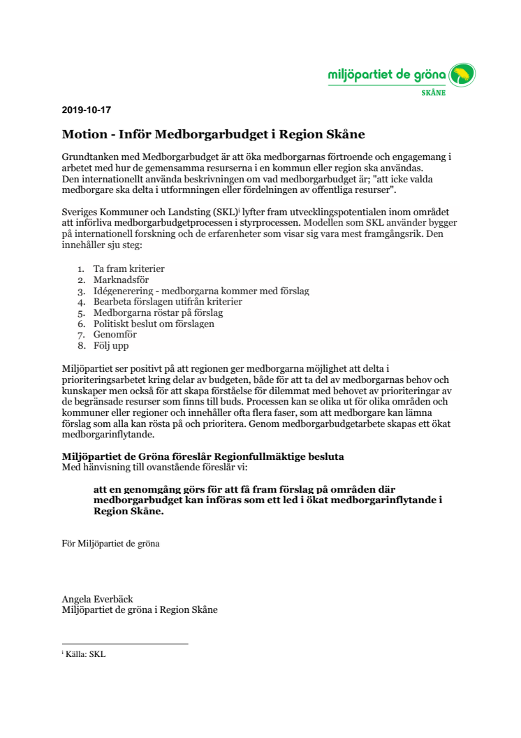 I en motion som lämnas in till regionfullmäktige idag föreslår Miljöpartiet att Region Skåne tar fram förslag på områden där en medborgarbudget kan införas. Med en medborgarbudget skulle Region Skåne avsätta pengar att disponeras av medborgarna. Skåningarna får både lämna förslag och själva bestämma vilket eller vilka förslag som ska genomföras.