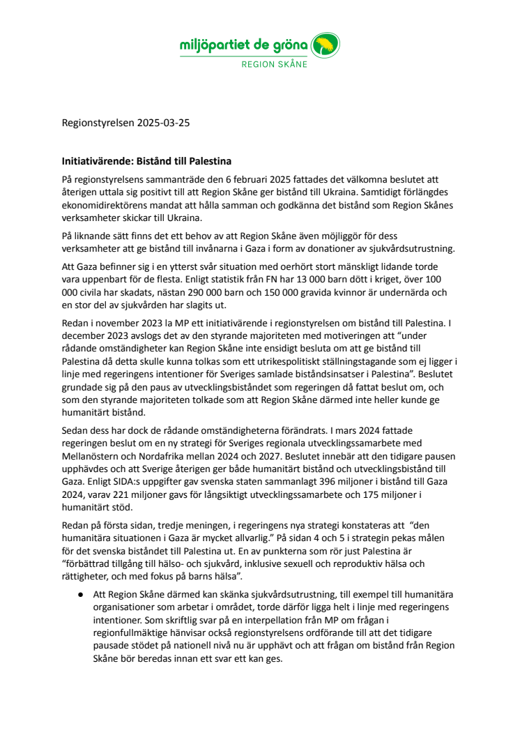 Redan i november 2023 la Miljöpartiet ett liknande förslag i regionstyrelsen. Då sa det borgerliga styret och Sverigedemokraterna nej med hänvisning till att regeringen hade pausat utvecklingsbiståndet till Palestina. Den pausen är sedan ett år tillbaka upphävd. Istället har regeringen fattat beslut om en ny strategi för biståndet till Mellanöstern, där just hälso- och sjukvård pekas ut som ett fokusområde för det svenska biståndet till Palestina.