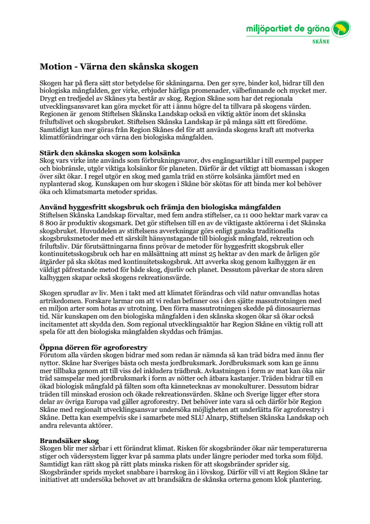 – Skogen är en våra mest värdefulla tillgångar, både för den biologiska mångfalden och i kampen mot klimatförändringar. Låt det förbli så! Det är hög tid att Region Skåne stärker sitt arbete för att skydda den skånska skogen. Miljöpartiet vill att regionen börjar se skogens betydelse och tar beslut som tar tillvara på allt som träden bidrar med, säger Thomas Hansson (MP), ledamot i regionfullmäktige och regionala utvecklingsnämnden.
