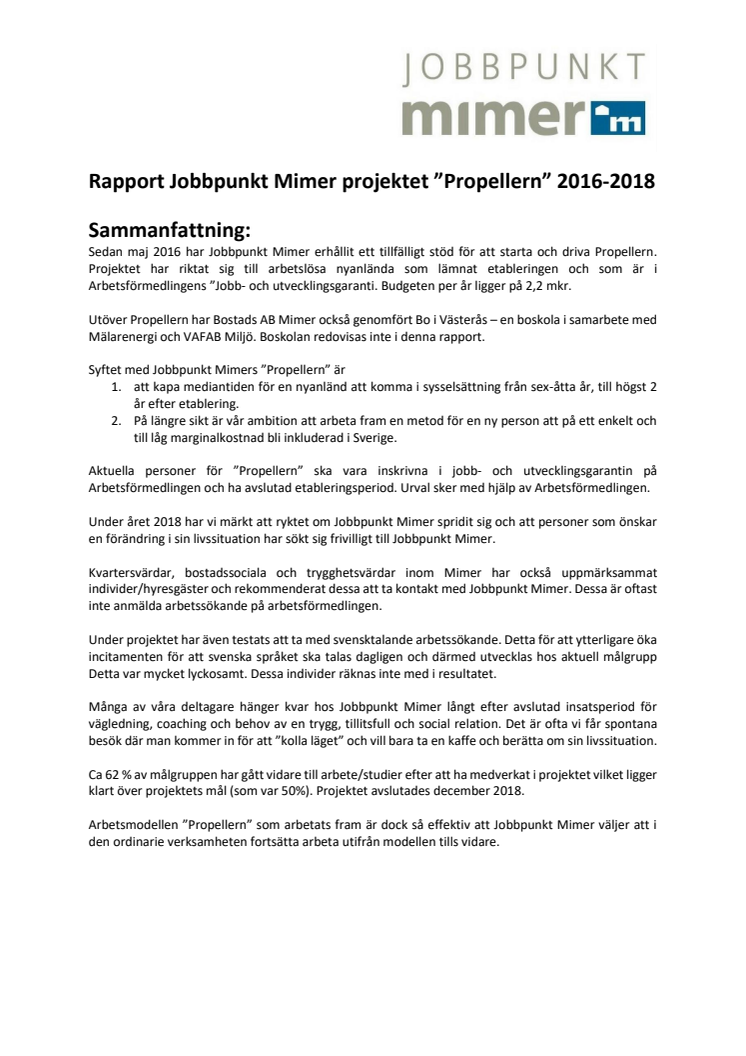 Mellan år 2016 till 2018 har totalt 133 personer genomgått jobb- och studiematchningsprojektet Propellern. Av dessa har 50 fått jobb och 32 har påbörjat studier. Propellern är ett projekt inom Jobbpunkt Mimer vars syfte är att hjälpa relativt nyanlända arbetslösa personer att snabbare komma in i arbete eller studier.