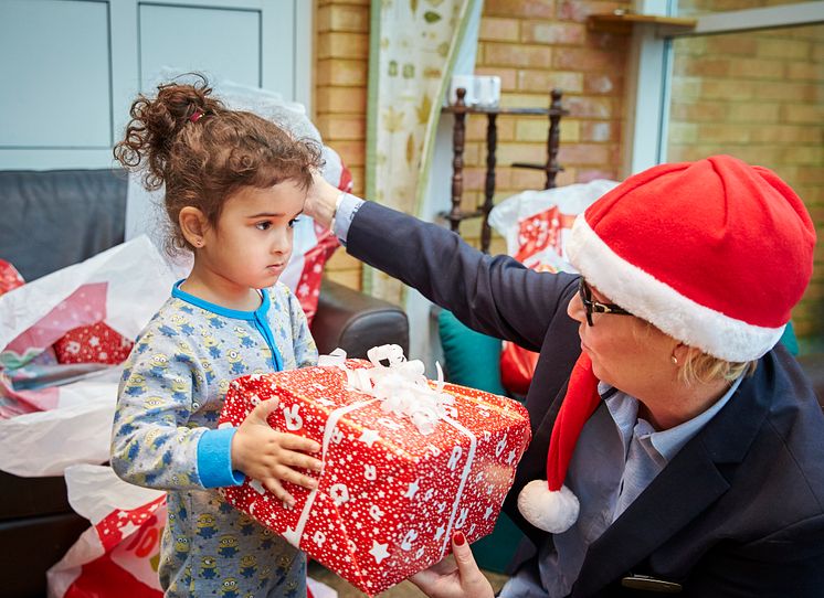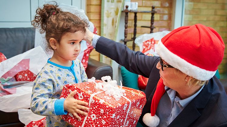 Flicka på asylboende får julklapp av en av Mimers anställda