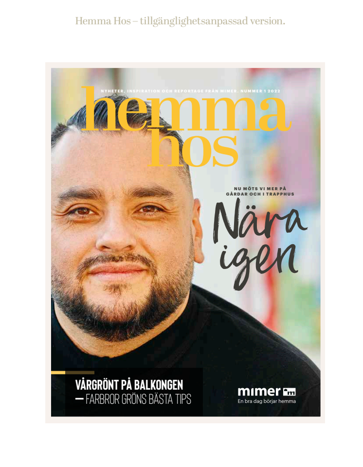 Alla våra hyresgäster får Hemma Hos direkt hem i brevlådan fyra gånger/år. Nummer två delas ut till samtliga västeråsare som samhällsinformation. Vi gör reportage hos hyresgäster, diskuterar bostadspolitiska- och miljöfrågor samt presenterar vår verksamhet och våra medarbetare. I tidningen finns det alltid tävlingar och schysta erbjudanden med Mimerkortet.