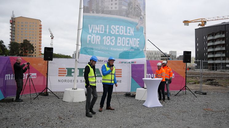 Ett hissat segel symboliserade byggstarten av 183 nya hyresrätter i kvarteret Förseglet på Öster Mälarstrand i Västerås. Det är Peab som på uppdrag av Bostads AB Mimer kommer att bygga sex sammansatta hus med lägenheter från 1 till 4 rum och kök. I projektet ingår även byggnation av parkeringsgarage, innergård och cykelhus. Planerad inflyttning är senare delen av 2024.