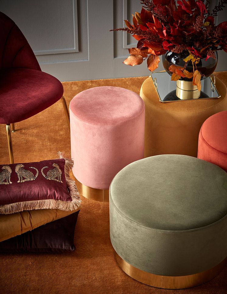 Sittpall Blanca i lila eller korallfärgad sammet med sockel i guldfärgad metall eller mörkgrå sammet med sockel i silverfärgad metall, Ø 36, H 47 cm 599·, i mörkgrå sammet med