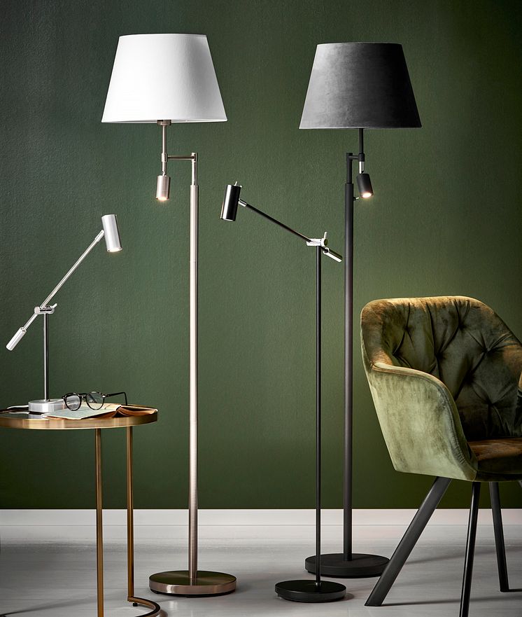 kromfinish eller svart med LED-läslampa, H 140 cm 1.295· Lampskärm Velvet i sammet,