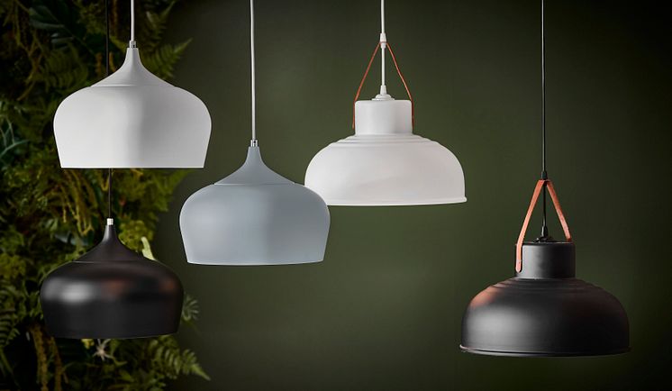 Taklampa Clifton i vit, svart eller grå lackerad metall, Ø 35, H 28 cm 899· Taklampa Edward i vit eller svart metall med läderdetalj, Ø 40, H 25 cm 599·