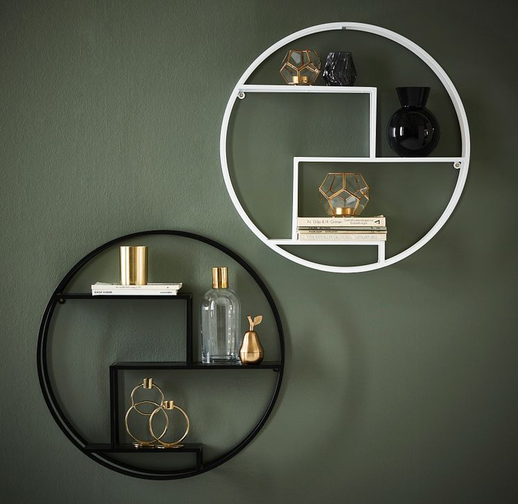 Vägghylla Gatsby i svart- eller vitlackerad metall, 3 hyllplan, Ø 60, D 13 cm 399· Ljuslykta