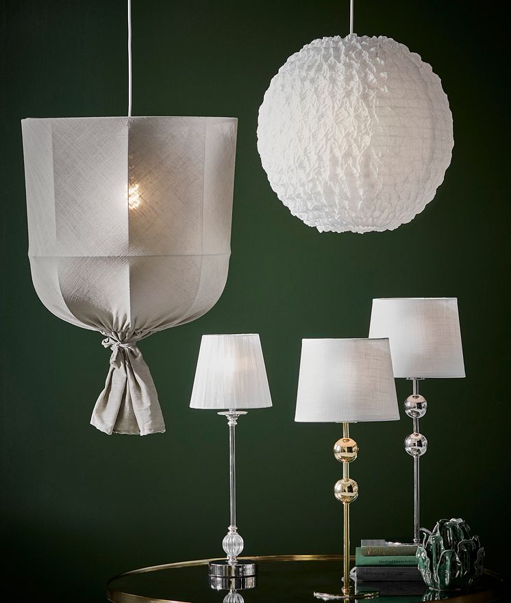NYHET Taklampa Polar i vitt tyg, Ø 38 cm 399· Bordslampa Carla i kromfinish med