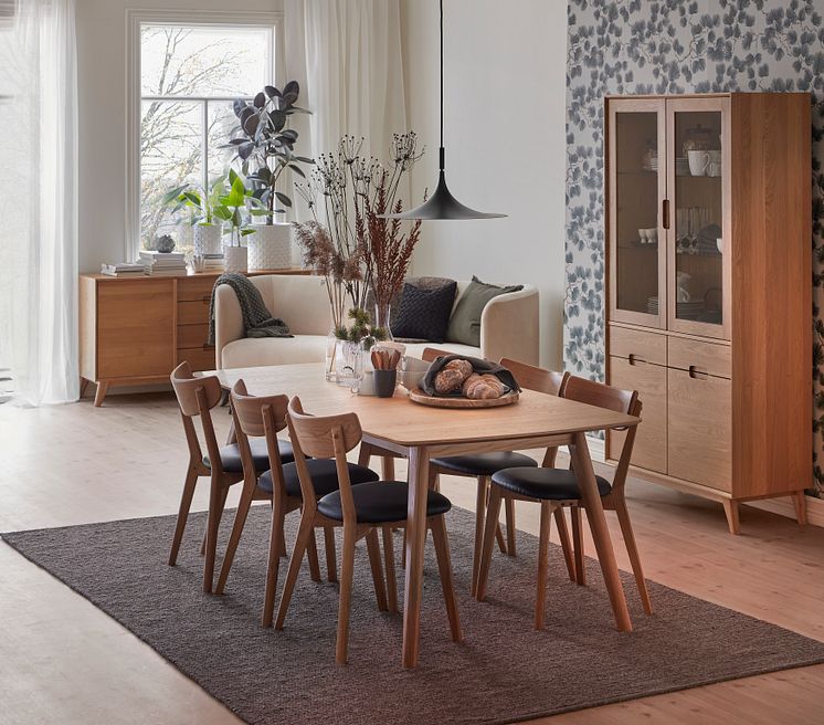 Serie Holger i lackerat ekfaner med underrede i massiv ek Matbord med 1 iläggsskiva à 50 cm, 190-240x100 cm 5.995· Stol med sits i svart konstläder 999· Paketpris 11.595·