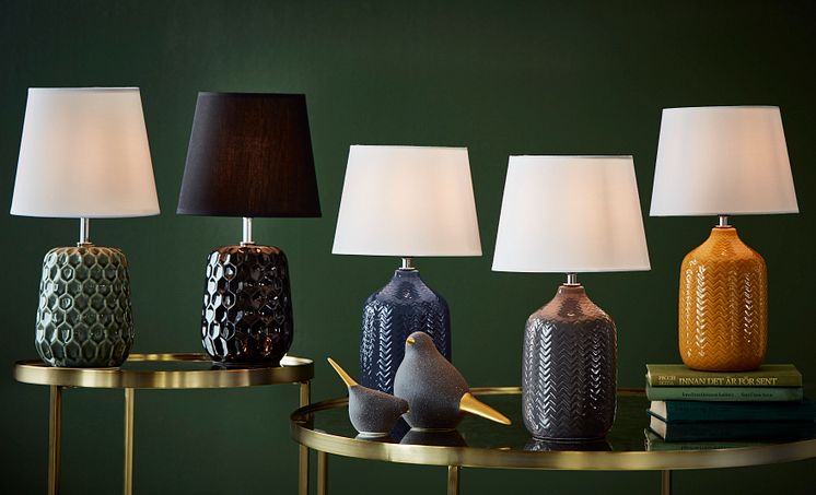 NYHET Bordslampa Honey i grön keramik med skärm i vitt tyg eller svart keramik med skärm i svart tyg, Ø 22, H 41,5 cm 299· NYHET Bordslampa Zack i blå, grå eller gul