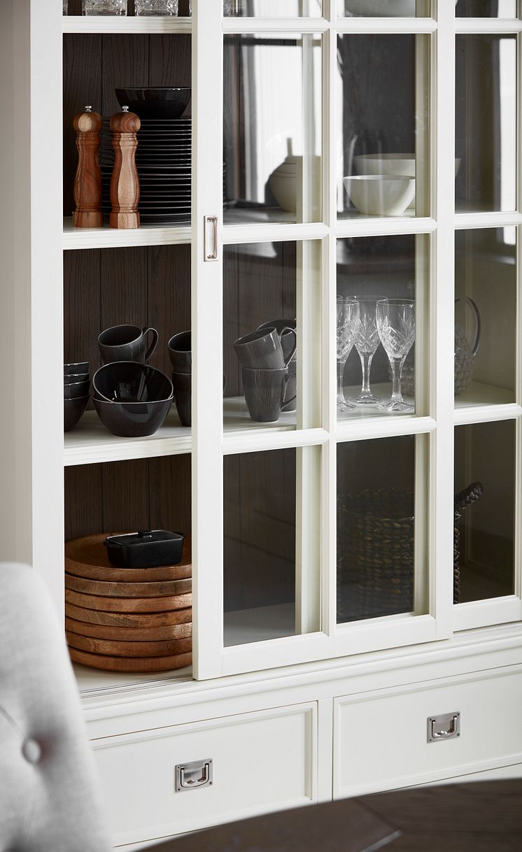 Vitrinskåp Marstrand i vitlack, 2 lådor och 2 skjutdörrar, B 130, D 47, H 210 cm 13.995·