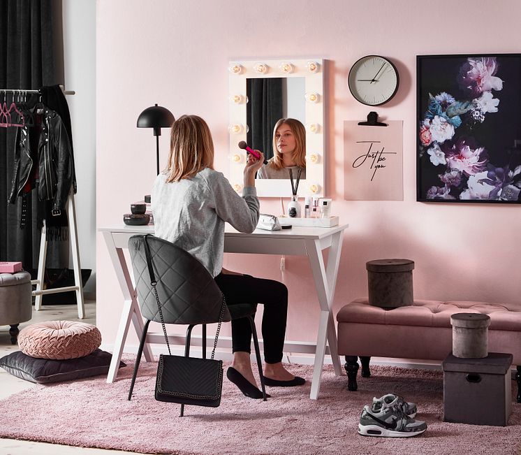 NYHET Sminkspegel Mira i vit- eller svartlackerad metall med plats för 12 ljuskällor, B 50, H 70 cm 1.195· Skrivbord