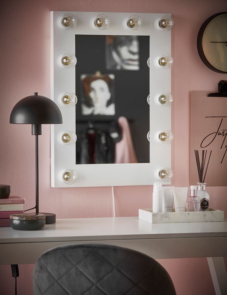 NYHET Sminkspegel Mira i vit- eller svartlackerad metall med plats för 12 ljuskällor, B 50, H 70 cm 1.195·
