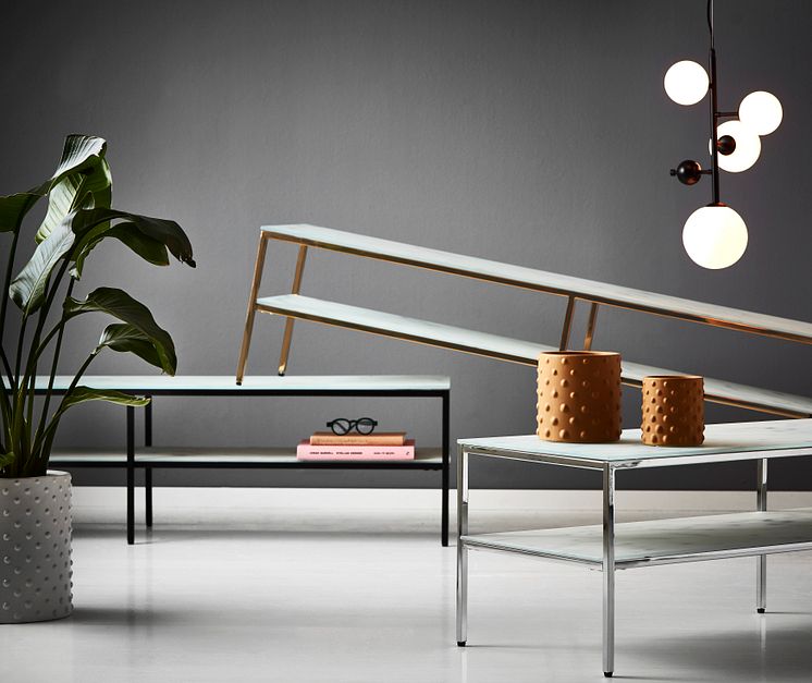 TV-bänk Nelly i marmormönstrat glas med ram i svartlackerad metall, 1 hyllplan, B 160,