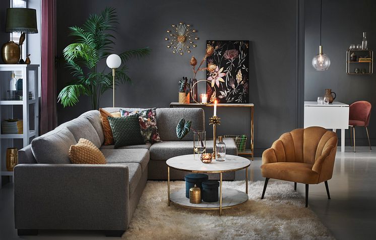 3-sits soffa med divan Nevada i tyg Alex stone med armstöd B och svarta ben, B 283, D 92/196, H 80 cm 7.995·. Pris fr. 5.995· NYHET Fåtölj Gloria i gul sammet med svartlackerade