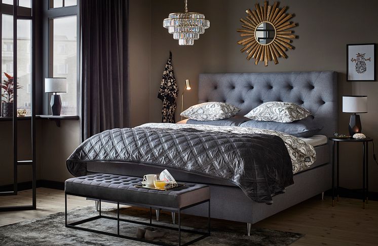 Kontinentalsäng New York i tyg Lux stålgrå, med bäddmadrass och 12 cm metallben, 180x200 cm Specialpris 9.995· (12.995·) Huvudgavel New York pikerad, B 180 cm 4.995· Paketpris