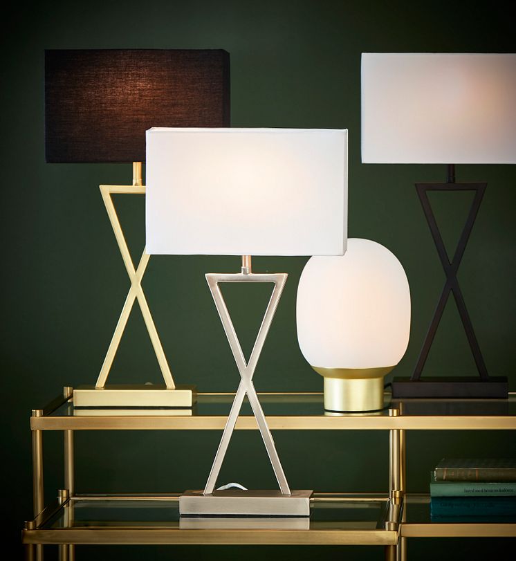 eller nickelfinish med skärm i vitt tyg, B 27, D 12, H 54 cm 499· NYHET Bordslampa