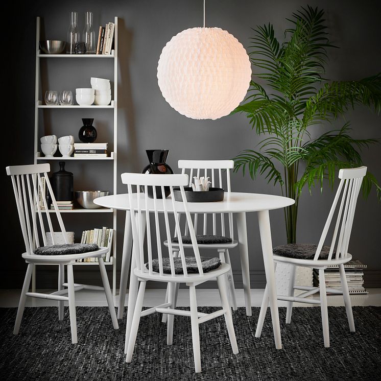 Matbord Plaine i vitlack med ben i vitlackerad björk, Ø 110 cm 1.895· Stol Einar i vitlackerat
