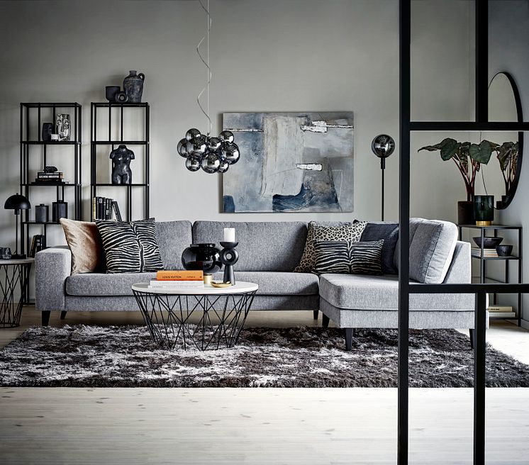 NYHET 3-sits soffa med divan Sierra i tyg Alex stone med armstöd A och wengébetsade ben, B 000, D 00, H 00 cm 7.495· Soffbord Penny i vit marmor med underrede i svartlackerad