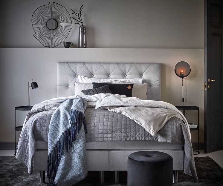 Kontinentalsäng Siesta i tyg Carabella ljusgrå, med bäddmadrass och 16 cm metallben, 160x200 cm 7.495· Huvudgavel Flash pikerad, B 160 cm 2.095·