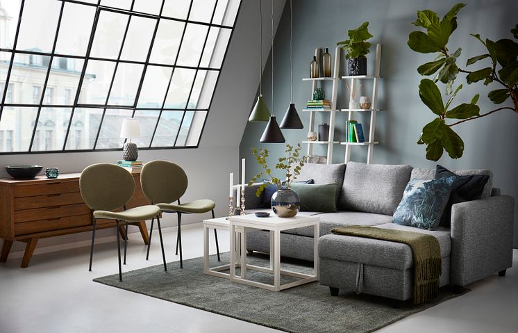 Bäddsoffa med flyttbar schäslong Skaftö i tyg Rocco dark grey/svart tyg med svarta ben, längsbäddad, B 223, D 88/148, H 82 cm, bäddmått 138x200 cm 5.995·