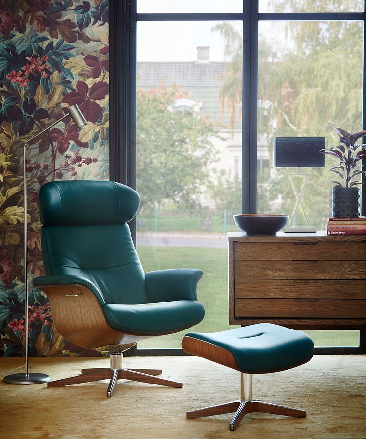 Fåtölj Timeout i läder Bolzano teal med underrede i valnötsfaner och snurrfot i ek/aluminium, B 80, D 81, H 101 cm 15.790·. Pris i tyg fr. 10.990· Fotpall Timeout, L 51, B 39, H 34-39 cm