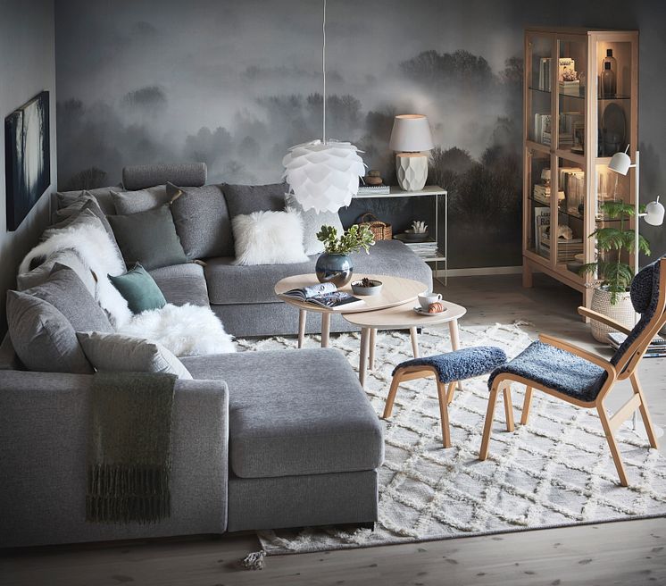 fotpall Frank i fårskinn grafit med ben i ek, B 56, D 86, H 104 cm 8.995· Soffbord Anne i vitpigmenterat lackerat ekfaner, L 70, B 70, H 45 cm 2.195·, L 90, B 90, H 48 cm 2.395·