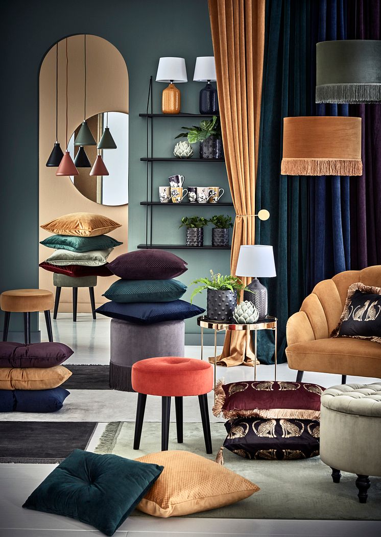 fr. 49· Sammetskudde med knapp, fiberinnerkudde ingår, 30x50 cm 79· Stolsdyna, 40x40 cm 99· Gardin, 2-pack,