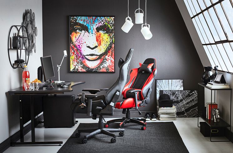 Skrivbord Strike i svart melamin med underrede i svartlackerad metall, B 80, H 72 cm 2.495· Gamingstol XP3 i rött och svart konstläder, höj- och sänkbar med tiltfunktion 1.995·