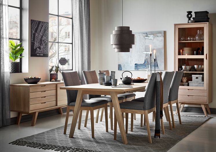 och rygg i grått tyg och underrede i vitpigmenterad lackerad ek 1.595· Paketpris 16.995· (17.565·) bord + 6 stolar