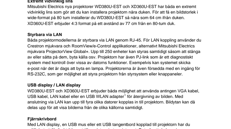 Mitsubishi Electrics nya projektorer WD380U-EST och XD360U-EST har båda en extremt vidvinklig lins som gör att du kan installera projektorn nära duken. För att få en bildstorlek i wide-format på 80 tum installerar du WD380U-EST så nära som 64 cm ifrån duken. XD360U-EST erbjuder 4:3 format på ett avstånd av 77 cm från en 80-tum duk.