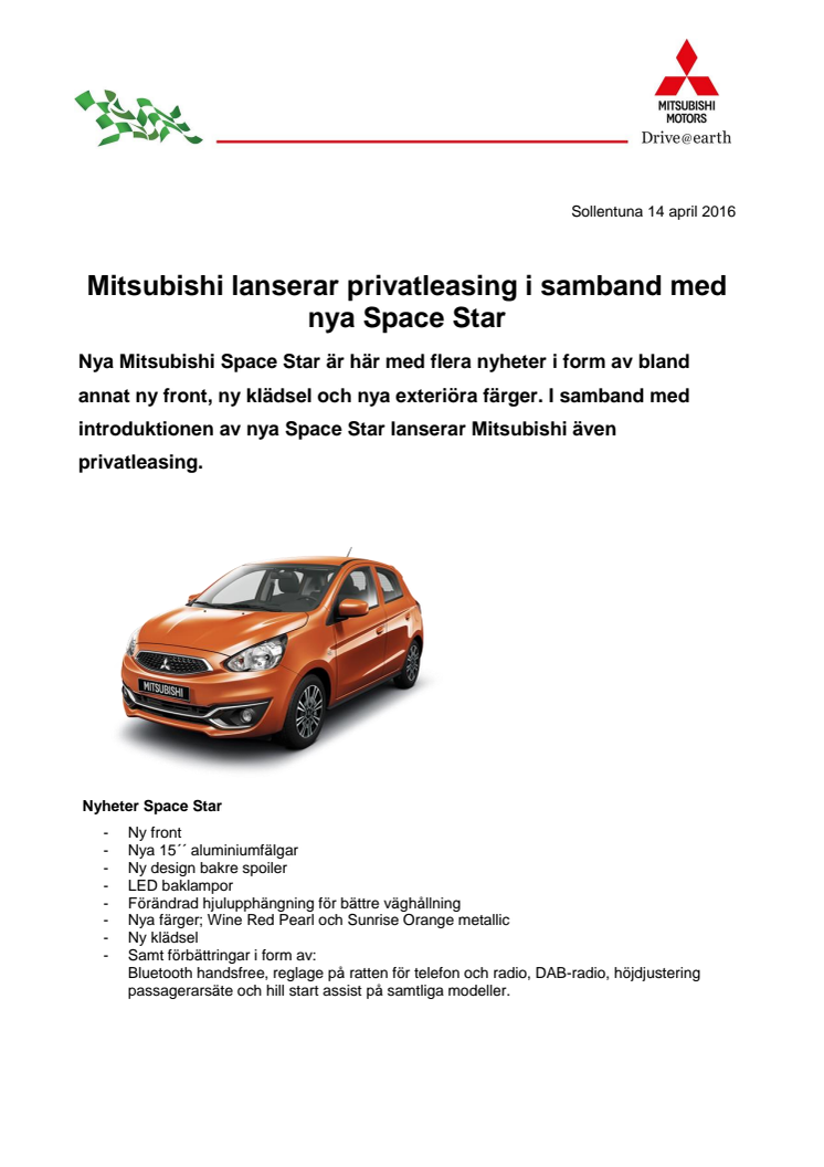 Nya Mitsubishi Space Star är här med flera nyheter i form av bland annat ny front, ny klädsel och nya exteriöra färger. I samband med introduktionen av nya Space Star lanserar Mitsubishi även privatleasing.