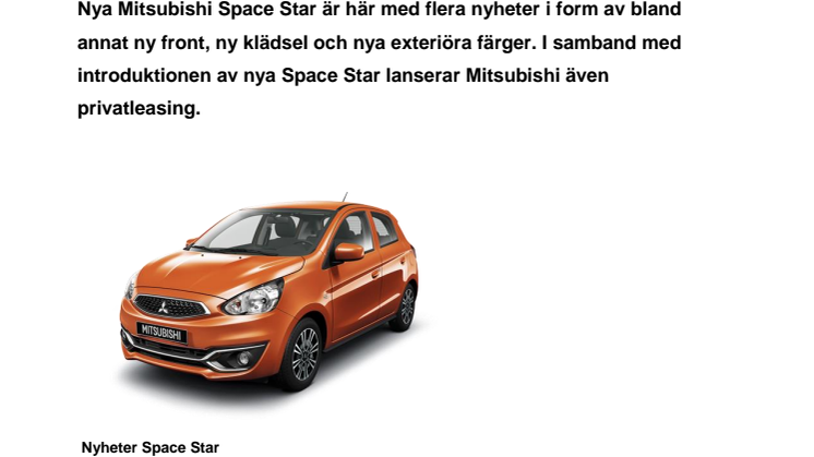 Nya Mitsubishi Space Star är här med flera nyheter i form av bland annat ny front, ny klädsel och nya exteriöra färger. I samband med introduktionen av nya Space Star lanserar Mitsubishi även privatleasing.