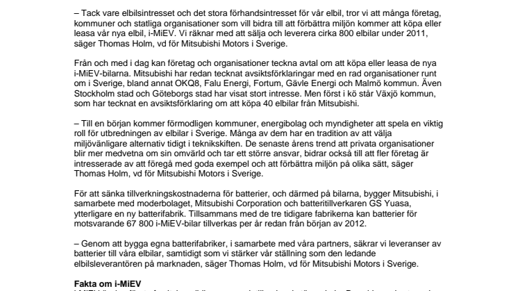 – Tack vare elbilsintresset och det stora förhandsintresset för vår elbil, tror vi att många företag, kommuner och statliga organisationer som vill bidra till att förbättra miljön kommer att köpa eller leasa vår nya elbil, i‑MiEV. Vi räknar med att sälja och leverera cirka 800 elbilar under 2011, säger Thomas Holm, vd för Mitsubishi Motors i Sverige.