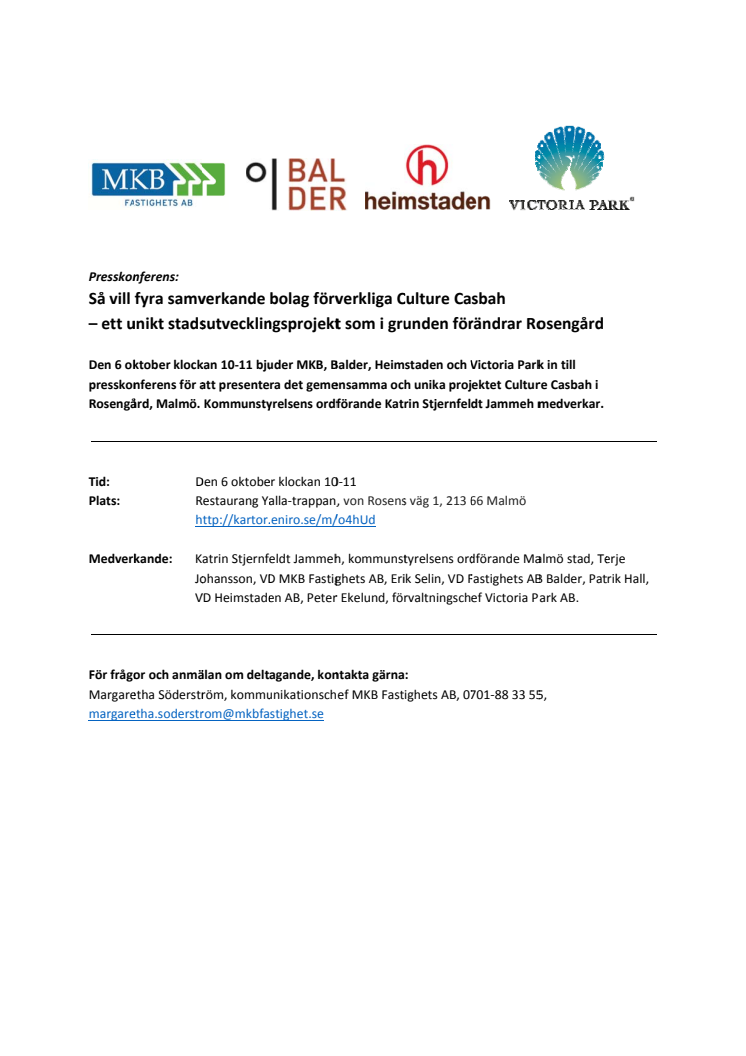 Den 6 oktober klockan 10-11 bjuder MKB, Balder, Heimstaden och Victoria Park in till presskonferens för att presentera det gemensamma och unika projektet Culture Casbah i Rosengård, Malmö. Kommunstyrelsens ordförande Katrin Stjernfeldt Jammeh medverkar.
