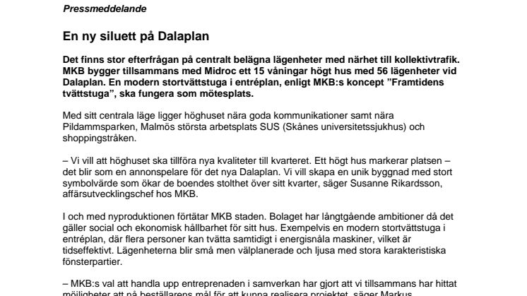 Det finns stor efterfrågan på centralt belägna lägenheter med närhet till kollektivtrafik. MKB bygger tillsammans med Midroc ett 15 våningar högt hus med 56 lägenheter vid Dalaplan. En modern stortvättstuga i entréplan, enligt MKB:s koncept ”Framtidens tvättstuga”, ska fungera som mötesplats.