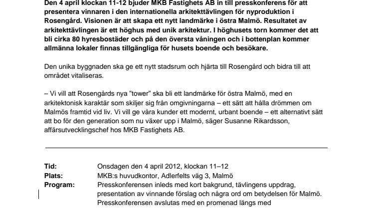 Den 4 april klockan 11-12 bjuder MKB Fastighets AB in till presskonferens för att presentera vinnaren i den internationella arkitekttävlingen för nyproduktion i Rosengård. Visionen är att skapa ett nytt landmärke i östra Malmö. Resultatet av arkitekttävlingen är ett höghus med unik arkitektur. I höghusets torn kommer det att bli cirka 80 hyresbostäder och på den översta våningen och i bottenplan kommer allmänna lokaler finnas tillgängliga för husets boende och besökare.