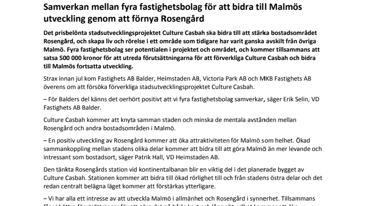 Strax före jul kom Fastighets AB Balder, Heimstaden AB, Victoria Park AB och MKB Fastighets AB överens om att försöka förverkliga stadsutvecklingsprojektet Culture Casbah.