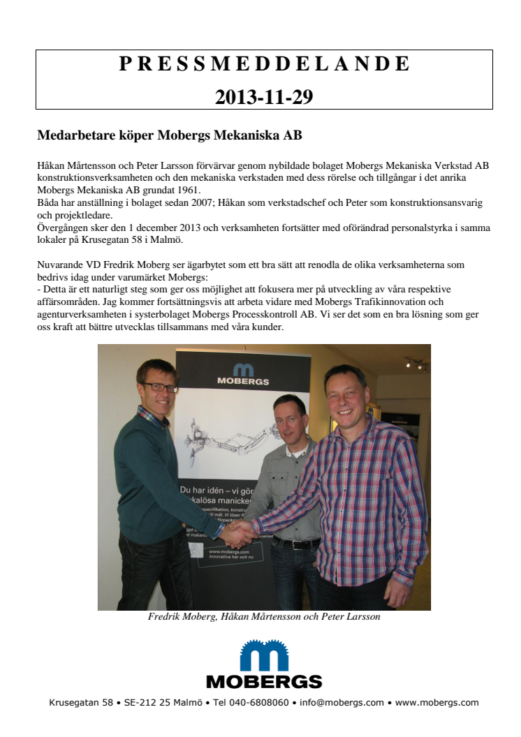 Håkan Mårtensson och Peter Larsson förvärvar genom nybildade bolaget Mobergs Mekaniska Verkstad AB konstruktionsverksamheten och den mekaniska verkstaden med dess rörelse och tillgångar i det anrika Mobergs Mekaniska AB grundat 1961.