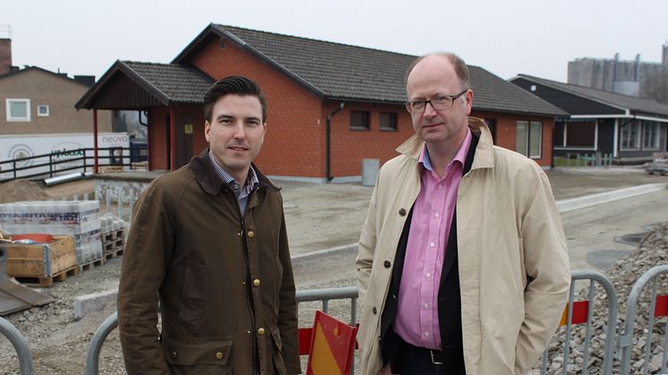 Patric Åberg och Pontus Lindberg vid det pågående bygget av ny busstation i Knislinge. Foto: Peter J Olsson (CC BY-SA)