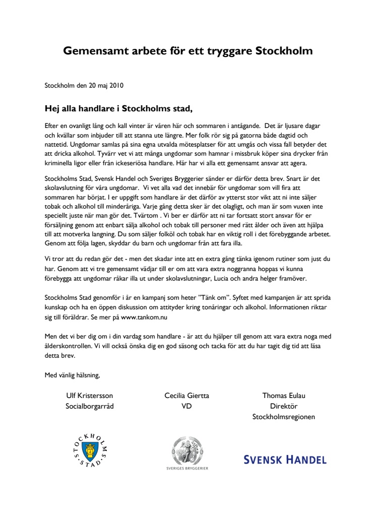 I dagarna sänder Stockholms stad, Svensk Handel och Sveriges Bryggerier ett gemensamt brev till stadens handlare med huvudbudskapet att de ska vara extra noga med att kontrollera ålder på köpare av alkohol och tobak. Dessutom genomför nu Stockholms Stad en kampanj som heter ”Tänk om” riktad till föräldrar för att sprida kunskap och skapa diskussion om attityder kring tonåringar och alkohol.