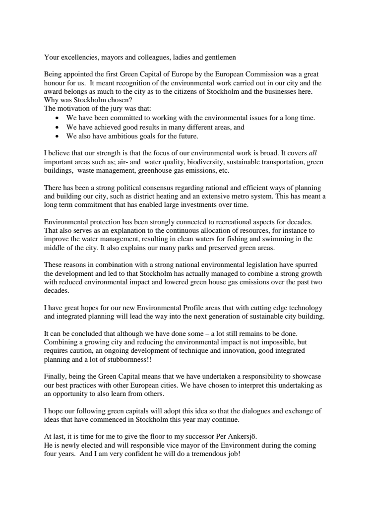 Idag talar borgarrådet Ulla Hamilton på Stockholms Miljöhuvudstadskonferens, EGCC. I och med den nya mandatperioden lämnar Ulla Hamilton (M) över stafettpinnen till nya stadsmiljöborgarrådet Per Ankersjö (C). Samtidigt vill Ulla Hamilton understryka att hennes miljöengagemang kommer att slå igenom även i hennes nya ansvarsområden, inte minst företagarfrågor.