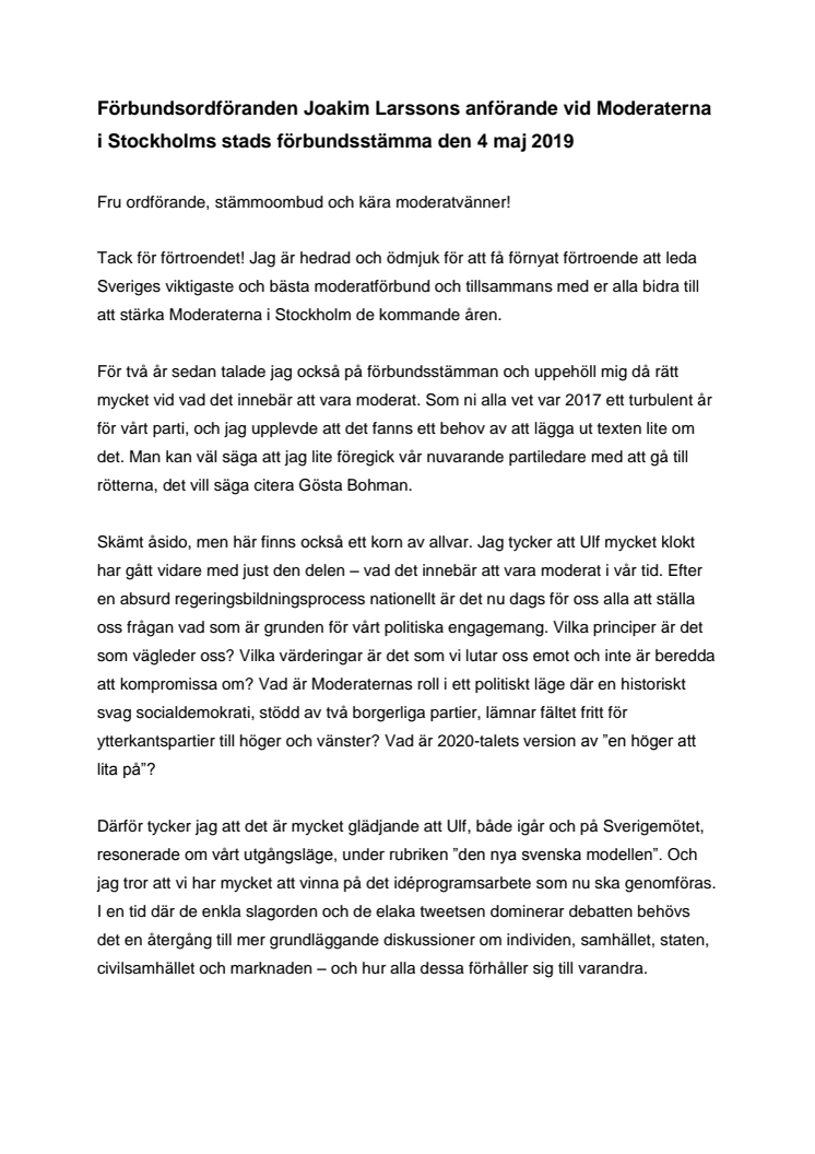 Stadsbyggnadsborgarrådet Joakim Larsson har idag valts om som förbundsordförande för Moderaterna i Stockholms stad av en enhällig förbundsstämma.