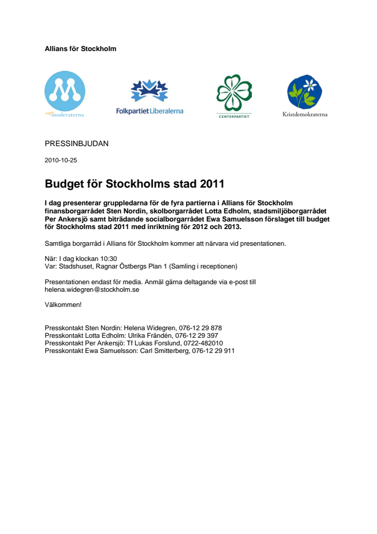 Pressinbjudan I DAG: Budget för Stockholms stad 2011
