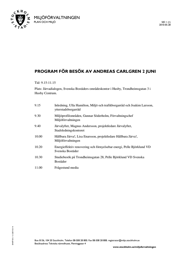 I morgon tisdag 2/6 besöker miljöminister Andreas Carlgren Husby och Järvafältet för att få veta hur Stockholms stad i olika delar arbetar med ytterstadsutveckling av Järvafältet och i samband med detta med miljöområdesprofileringen av miljonprogrammen, om miljövänliga och energieffektiva renoveringar och moderna energieffektiviseringar.