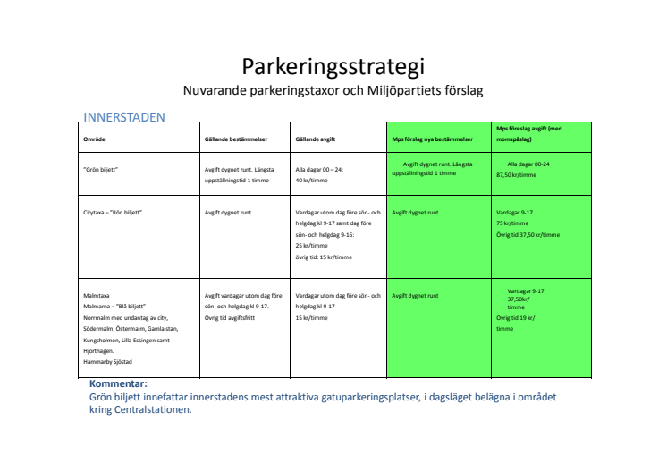 SKL:s rapport ”Parkering på gatumark” hade sett annorlunda ut om de rödgröna hade suttit vid makten i Stockholm. Miljöpartiet vill ta ut ytterligare 250 miljoner kronor varje år av Stockholms bilister i höjda p-avgifter. Det skulle resultera i chockhöjningar av p-avgifterna i både ytterstaden och innerstaden. Samtliga stadens gator ska avgiftsbeläggas dygnet runt.