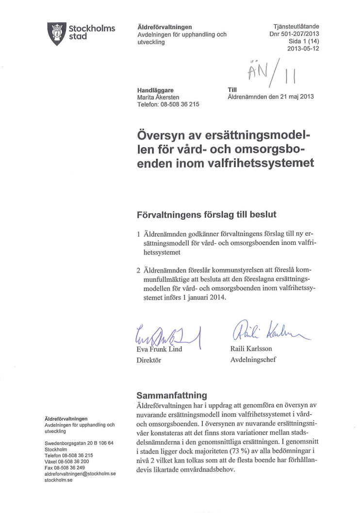 Stockholms stad inför en äldreboendepeng för biståndsbedömt boende från och med den 1 januari 2014. Det innebär att dagens olika vårdnivåbedömningar försvinner och ersätts med en peng för somatiskt sjuka och en för den som har en demensdiagnos. Samtidigt permanentas stadshusalliansens satsning med 50 miljoner kronor extra per år till demensboenden i staden som infördes 2011.