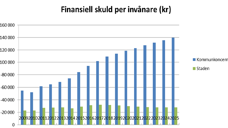 - En i hög takt ökande skuld medför att staden behöver låna stora volymer på de finansiella marknaderna. Stora volymer ökar även kommunkoncernens utsatthet vid tider av förhöjd risk på de finansiella marknaderna.
